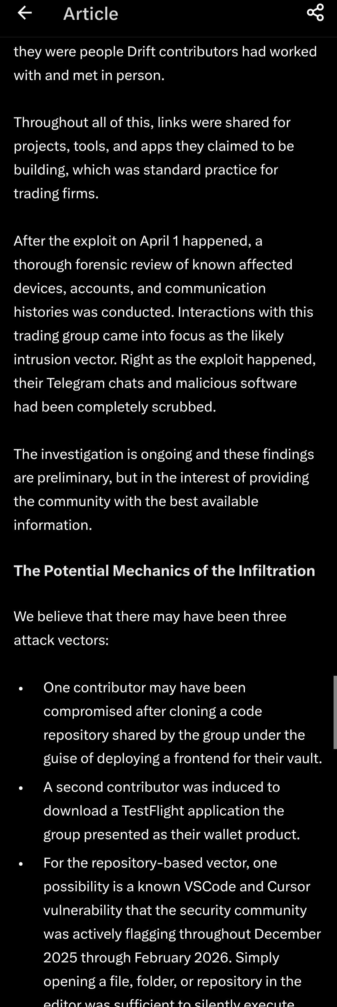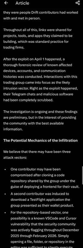 🔹 𝐀 𝐫𝐞𝐥𝐚𝐭𝐢𝐨𝐧𝐬𝐡𝐢𝐩 𝐡𝐚𝐝 𝐛𝐞𝐞𝐧 𝐞𝐬𝐭𝐚𝐛𝐥𝐢𝐬𝐡𝐞𝐝, 𝐜𝐨𝐧𝐭𝐫𝐢𝐛𝐮𝐭𝐨𝐫𝐬 𝐝𝐢𝐝𝐧'𝐭 𝐭𝐡𝐢𝐧𝐤 𝐭𝐰𝐢𝐜𝐞 𝐰𝐡𝐞𝐧 𝐜𝐨𝐥𝐥𝐚𝐛𝐨𝐫𝐚𝐭𝐢𝐧𝐠 𝐝𝐢𝐠𝐢𝐭𝐚𝐥𝐥𝐲. Drift presumes there may have been multiple technical attack vectors: One contributor may have been compromised after cloning a code repository shared by the group as part of efforts to deploy a frontend for their vault. A second contributor was persuaded into downloading a wallet product via Apple's TestFlight to beta test the app.