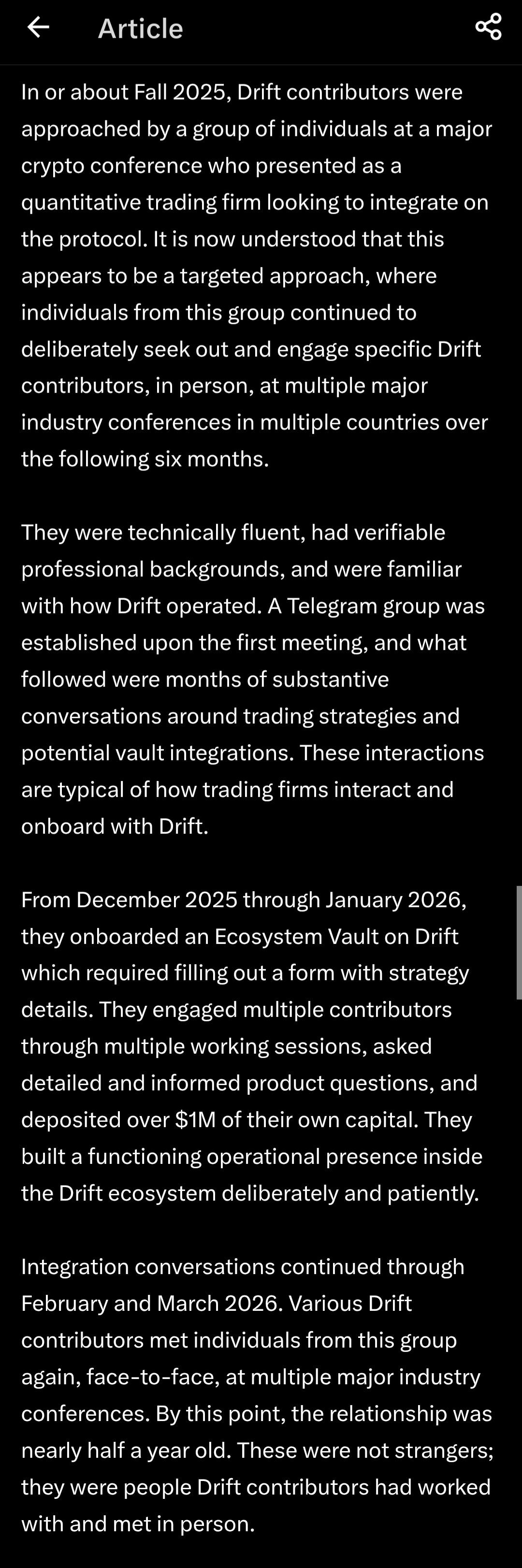 TL;DR North Korean-linked threat actors pulled off a $285M heist against crypto exchange Drift using IN-PERSON social engineering. They deployed proxies to global conferences to befriend Drift contributors, spent 6 months building a relationship as customers, and even deposited $1M of their own funds to prove they were legitimate.